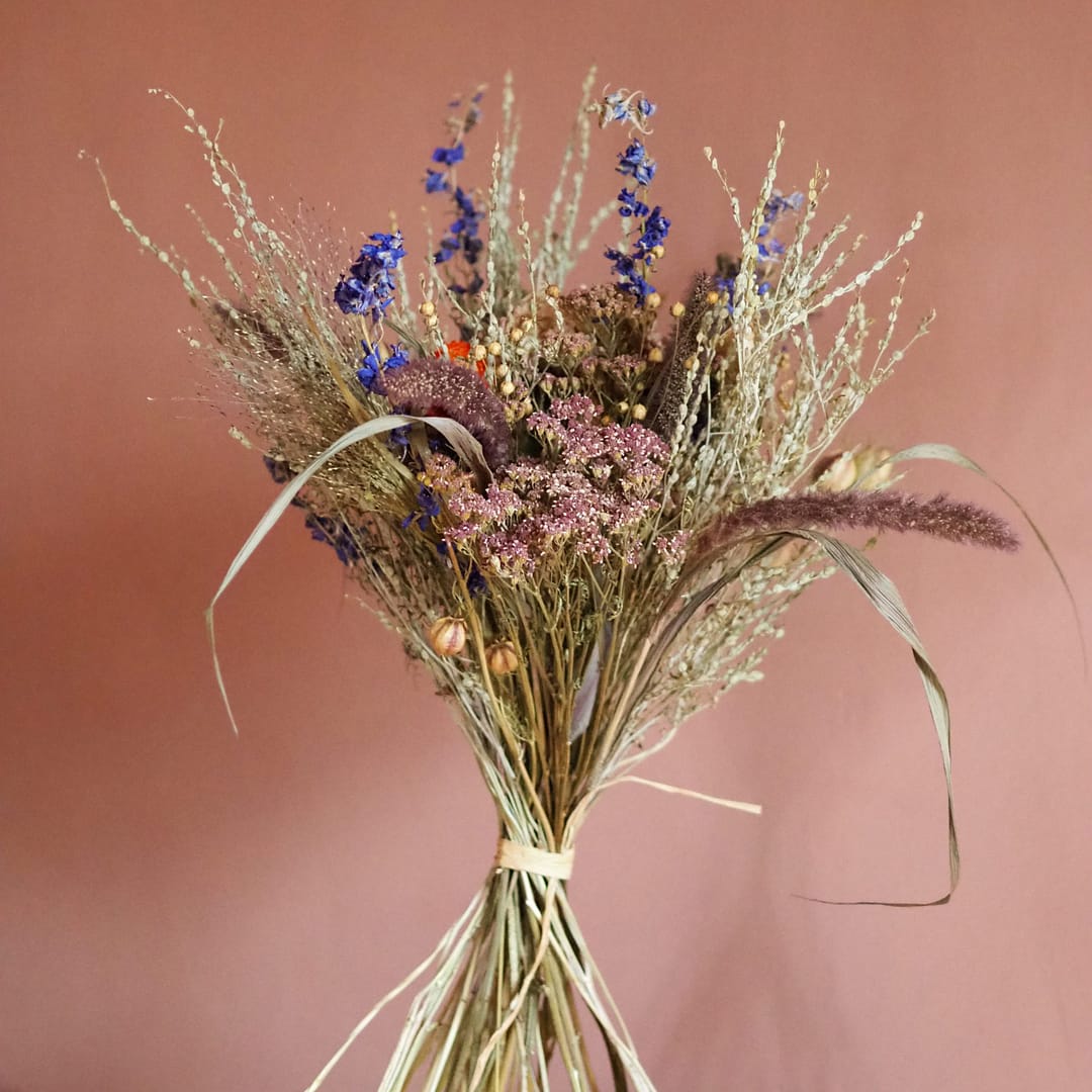 Du bekommst einen Strauß aus Trockenblumen aus eigenen Anbau, ungefärbt und sonnengetrocknet.